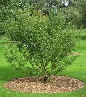 Дерево или высокий ветвистый кустарник высотой до 6 м. Кора ствола и более старых ветвей тёмно-серая; ветки желтовато-серые, слегка ребристые; побеги голые или в начале слабо опушённые; годовалые — коричневые. Колючки отсутствуют или немногочисленные, прямые, длиной 1—2 см.
