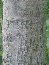 Сверху вниз: Кора в нижней части ствола. Лист. Цветок. Плоды. |