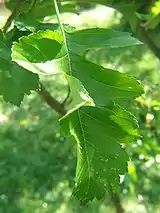 Листья сверху ярко-зелёные, блестящие, голые, снизу несколько бледнее, волосистые по жилкам, яйцевидные или продолговато-яйцевидные, с острой или несколько усечённой вершиной и клиновидным или низбегающим основанием, глубоко перисто-надрезанные, лопастные, у основания листа раздельные или почти рассечённые, с 3, реже 2—4 парами продолговато-треугольных, острых, пильчатых долей; на коротких побегах — длиной до 6—8 см и шириной 5—6,5 см, на длинных — длиной до 12 см и шириной 8 см. Черешки длиной 2—6 см; прилистники серповидно-изогнутые, гребенчато-пильчатые, длиной до 1,5 см.