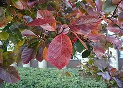 Сверху вниз: Листья в осенней окраске. Зрелые плоды. Косточки (увеличено) |