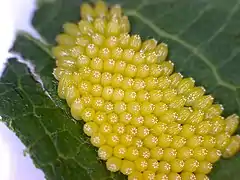 Яйца на верхней стороне листа Яблони (Malus domestica). Увеличение примерно в 20 раз.