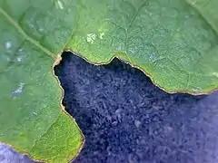 Погрыз гусеницы на листе черёмухи. Увеличение примерно в 20 раз.