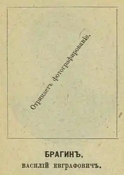 ![]() Объяснение отсутствия портрета В. Е. Брагина из альбома «Члены Государственной думы: портреты и биографии. Первый созыв, 1906—1911 г.» (1906) | |