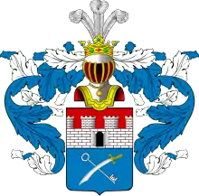 Щит разделён надвое, в верхней половине в красном поле изображена городская серебряная стена с отверстыми вратами и с четырьмя на ней башнями. В нижней половине в голубом поле положены крестообразно серебряные ключ и сабля, остриём вниз.