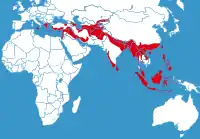 Ареал охватывает Юго-Восточную Европу, Малую и Переднюю Азию, Индию, Малайский и Зондский Архипелаг, Филиппинские острова, остров Тайвань[4]. На территории бывшего СССР — Закавказье и Среднюю Азию[1], Ростовскую область и Крым[2]