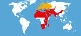 Северная Африка, Южная Европа, Крым, юг европейской части России, Кавказ, Средняя Азия, Казахстан, Монголия, Китай, Индия. Активно мигрирующий вид. Три залетевшие особи отловлены на юге Западной Сибири (Новосибирская область: Новосибирск в 1952 году, Ордынское в 1953 году[6]); другие находки из азиатской части России не известны.