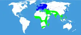 В Южную Европу залетает, оставляет там потомство, из южнее расположенных стран ареал включает всю Африку и Индию, прибрежные страны Средиземного моря, весь Ближний Восток, включая Турцию, Ирак, Иран, юг Туркменистана (залёты), Афганистан.