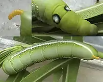 Гусеница зелёная или желтоватая; на каждой стороне третьего членика по точкообразному глазчатому пятну с белою серединою и чёрно-синим краем; позади третьего членика белая продольная линия; дыхальца с жёлтою оторочкою, хвостовый рог короткий, приплюснутый. Встречается на олеандрах и иногда на барвинке (Vinca). Гусеницы окукливаются на земле у олеандров, в коконе, состоящем из обломков листьев.