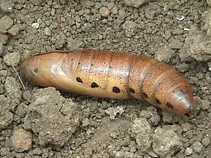 Куколка удлинённая, бурого цвета, с чёрным пятном на каждом дыхальце.