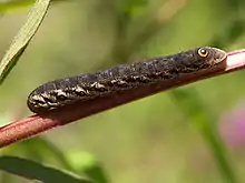 Гусеница бурого цвета, с чёрным рисунком из полос на боках. Стадия гусеницы с июля по август. Гусеницы активны ночью. Кормовое растение гусениц — иван-чай, первоцвет и вербейник и другие из кипрейных. Окукливание в почве. Зимует куколка.