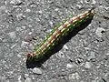 После вылупления гусеница имеет жёлтый окрас и длина её тела составляет 5 мм. На ранних возрастах гусеницы зелёные с белыми продольными полосами по бокам. Окраска гусеницы меняется с возрастом. На предпоследнем возрасте на спине появляется полоса красновато-бурого цвета, на последнем гусеница имеет грязновато-коричневый окрас со слабо выраженными продольными полосами. На заднем конце тела чёрно-бурый рог. Взрослая гусеница длиной 60-80 мм. Гусеницы в основном питаются хвоей сосны (Pinus sylvestris), не едят хвою молодых побегов, предпочитая прошлогоднюю.