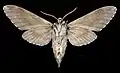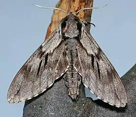 Размах крыльев 70-96 мм. Передние крылья серого цвета с изогнутой линией на вершине и тремя чёрными чёрточками в центре. Задние крылья коричневато-серые, без рисунка. Брюшко с поперечными чёрными и светло-серыми полосками и продольной серой полосой, разделённой надвое тонкой чёрной линией. Довольно равномерный окрас тела и крыльев варьируется от темно-коричневого до кремового цвета, но основным цветом является серый.