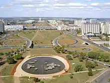 Проект строительства новой столицы, получивший название «пилотный план» (порт. Plano Piloto), был разработан архитектором Лусио Костой. С учётом рельефа местности и зоны затопления водохранилища Параноа «пилотный план» фактически является адаптацией аналогичного проекта, предложенного Луисом Крулсом в 1893 году[12]. Большинство административных и общественных зданий в городе построено по проекту известного бразильского архитектора Оскара Нимейера.