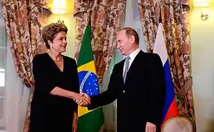 13—17 июля 2014 года Президент России Владимир Путин посетил Бразилию с официальным визитом, в ходе которого провёл переговоры с Президентом Бразилии Дилмой Роуссефф, по итогам которых подписан пакет документов о сотрудничестве, а также принял участие в работе саммита БРИКС, посвященного вопросам политической координации и глобального управления[9].