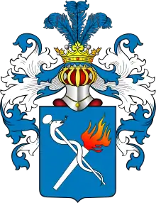 На щите дворянский коронованный шлем. Нашлемник: три лазоревых страусовых пера. Намёт на щите лазоревый, подложенный серебром.