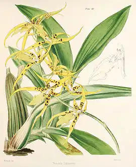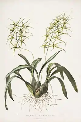 ![]() Brassia verrucosa ботаническая иллюстрация из "The Orchidaceae of Mexico and Guatemala", pl. XXII | ||||||||||||||