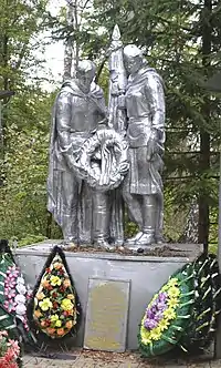 ![]() Воины, мужчина и женщина со знаменем, преклонившись, возлагают венок. Братская могила военнослужащих Красной Армии, погибших в годы Великой Отечественной войны (1942—1943) | |