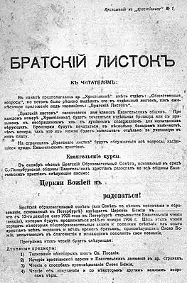 "В начале предполагалось в «Христианине» иметь отдел: «Общественные вопросы», но потом было решено выделить его в отдельный листок, как ежемесячное приложение под названием: «Братский листок».