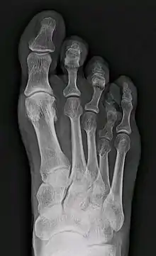 Брахиметатарзи́я (англ. brachymetatarsia, др.-греч. βραχυμεταταρσια: βραχυ — короткий; μεταταρσιο — плюсна) — это возникающая вследствие неизвестных причин редкая аномалия развития (укорочение) одной или нескольких плюсневых костей. Преждевременное закрытие зоны эпифизарного роста приводит к появлению дефекта: палец стопы (чаще всего четвёртый, но может быть и любой другой)[1], длина которого не изменена, располагается несколько проксимальнее и выше остальных. Брахиметатарзия может быть одно- или двусторонней, с преобладанием последней (72% случаев)[1]. Если затронуто более одного пальца на одной ноге, то такой порок называется брахиметаподией[2]. Укорочение первой плюсневой кости вызывает состояние, известное как палец Мортона, которое, впрочем, рассматривается как вариант нормы, поскольку не приводит к существенным изменениям внешнего вида стопы и появлению жалоб.