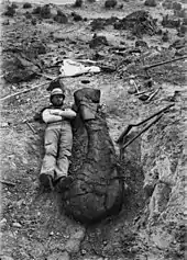 Прибыв 20 июня 1900 года, палеонтологи разбили лагерь на заброшенном ранчо Гот-Ранч (англ. Goat Ranch)[12]. Во время разведывательной поездки верхом на лошади полевой помощник Риггса Гарольд Уильям Менке обнаружил плечевую кость FMNH P 25107[8]; 4 июля[6] он воскликнул, что это «самая большая вещь на свете!» (англ. the biggest thing yet!). Сначала Риггс принял находку за плохо сохранившийся образец апатозавра или бронтозавра и отдал приоритет раскопкам в карьере №13 (англ. Quarry 13), в котором находился более многообещающий скелет Morosaurus (теперь считается синонимом камаразавра). Удостоверившись в наличии скелета, 26 июля он вернулся к плечевой кости в 13-м карьере, которая, как вскоре выяснилось, оказалась действительно огромных размеров, убедив Риггса в том, что он обнаружил самое большое наземное животное в истории[13]. В 1904 году Риггс отметил: «Если бы не необычный размер рёбер, связанных с ним, образец был бы отброшен как апатозавр, слишком плохо сохранившийся, чтобы представлять ценность» (англ. Had it not been for the unusual size of the ribs found associated with it, the specimen would have been discarded as an Apatosaur, too poorly preserved to be of value)[14].