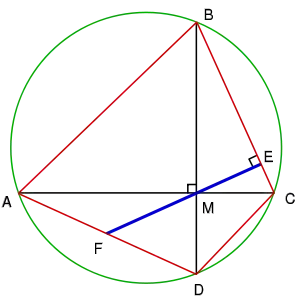 Пусть имеется вписанный четырёхугольник, диагонали которого взаимно перпендикулярны. Опустим из точки пересечения диагоналей перпендикуляр на одну из его сторон. Будучи продолженным по другую сторону от точки пересечения диагоналей, этот перпендикуляр делит противоположную сторону четырёхугольника на две равные части.