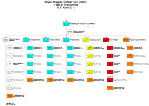 Каждая механизированная бригада состоит из трёх пехотных батальонов, одного разведывательного батальона, одного артиллерийского дивизиона, батальона материально-технического обеспечения, штаба бригады и штабной роты, и одного инженерного батальона. Вся SBCT имеет на вооружении более 300 транспортных средств семейства «Страйкер» и личный состав численностью 4 500 солдат.[7]