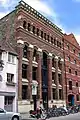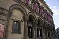Стиль отличается простым планом, грубыми материалами и разноцветным кирпичом: красный, жёлтый, чёрный и белый. На первом этаже оформлены арочные проходы, а верхние этажи объединены горизонтальными или вертикальными группами оконных проёмов.