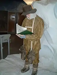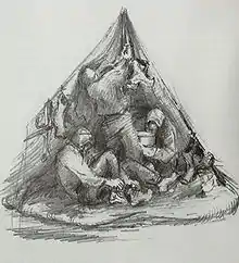 Полярная одежда у офицеров и матросов была одинакова. Поверх шерстяного нижнего белья носили фланелевую рубаху, поверх которой надевался свитер. На ногах носили меховые ботинки с толстой подошвой, закупленные в России. На воздухе обычно носили норвежские сапоги, а в походах и в сильный мороз лапландские каньги из оленьей шкуры, которые англичане называли finnesko. Поверх белья, брюк и свитеров надевали ветрозащитную габардиновую одежду фирмы Burberry. Скотт не считал меховую одежду настоятельно необходимой для полярных широт[80].