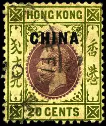 ![]() Одна из марок Гонконга с надпечаткой «China» («Китай»), применявшихся для франкирования в британских почтовых отделениях в Китае, 1917 (Sc #8) | |