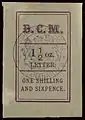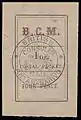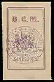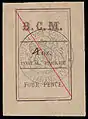 ![]() Первая марка британской консульской почты на Мадагаскаре (1884); надписи «B. C. M.», «POSTAL PACKET.» («Почтовая посылка») и «1 oz.» («1 унция»), 1 пенни, чёрная печать вице- консульства, гашение диагональной красной контрольной линией (Sc #1) | |
