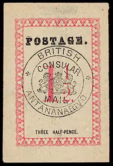 1886, надпись «Postage.», 1½ пенса, чёрная печать «British Consular Mail / Antananarivo» (Sc #34)