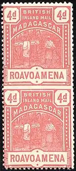 | Надписи для обозначения номинала малаг. «ROAVOAMENA» и англ. «4d» — 4 пенса, вертикальная пара (SG #58a) |
