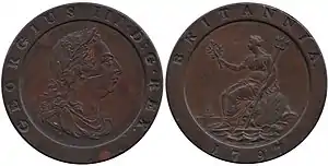 В 1797 году был выпущен первый медный пенни (медные фартинг и полпенни чеканили с 1672 года). Эта монета получилась унцией весом (28,3 г) и 36 мм в диаметре. На реверсе была изображена сидящая Британия. В 1806—1808 годах выпускали медный пенни весом 18,9 г и диаметром 34 мм. Следующие медные пенни были выпущены только в 1825 году, в годы правления Георга IV. Пенни весил 18,8 г и имел диаметр 34 мм.