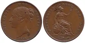 В 1860 году пенни стали делать из бронзы. Новая монета стала весить 9,4 г и имела диаметр 30,8 мм. С 1860 по 1970 год параметры монеты и внешний вид реверса практически не менялись.
