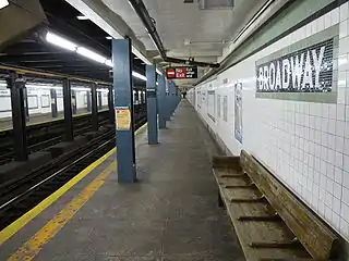 Станция была открыта 1 июля 1937 года. Представлена двумя боковыми платформами и двумя путями между ними. Стены покрыты белой плиткой с типичной для этой линии тёмно-зелёной декоративной линией. Также имеются мозаики с полным названием станции. Под декоративной линией есть маленькие чёрные мозаики с названием станции "BROADWAY", выполненным белыми буквами. До недавнего времени на одной из таких мозаик на платформе северного направления вместо "BROADWAY" было написано "BRODAWAY".
