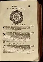Страницы (№№79-82, Ч1) из гербовника С. Окольского «Orbis Poloni» (1642, Краков) с описанием герба Brodzic: