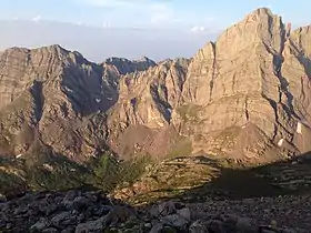 ![]() Брокен-Ханд-Пик, перевал Брокен-Ханд и Крестон-Нидл с западного хребта пика Гумбольдт Пиком | |