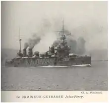 Следующая серия также состояла из трёх единиц типа «Монкальм» (фр. Montcalm). На них существенно усилилась защита артиллерии, но скорость оставалась недостаточной[48]. В 1903-1904 годах в строй вошли 5 крейсеров типа «Глуар» (фр. La Gloire). Их водоизмещение вновь выросло, приблизившись к 10 000 тонн, артиллерию поместили в испытанные одноорудийные башни, но хороший проект портила скромная скорость — чуть более 21 узла[49].