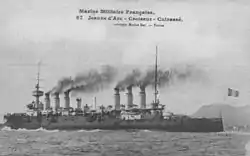 «Жанна д’Арк» рассчитывалась на скорость 23 узла, но достичь этого показателя не удалось. Зато огромное количество котлов привело к оригинальному решению — корабль получил невиданные ранее 6 труб — двумя группами по три штуки[43]. Тем не менее проект оценивается невысоко — для своих немалых размеров «Жанна д’Арк» оказалась слишком слабо вооружена[45]. В строй крейсер вошёл в 1902 году.