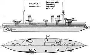 Программа 1902 года предусматривала закладку ещё четырёх броненосцев типа «Републик». Но ещё в ходе проектирования было решено пересмотреть проект в соответствии с новыми тенденциями на усиление вспомогательного калибра, проявившимися практически во всех основных флотах мира. Старомодная «скорострельная» артиллерия калибром 120—152 миллиметра повсеместно уступала место более тяжелым и мощным орудиям.