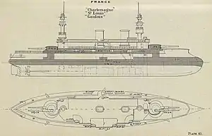 К середине 1890-х французский флот, на тот момент считавшийся вторым в мире после английского, практически не имел однотипных кораблей, что существенно осложняло управление эскадрой в бою.[1] Это привело к созданию серии «Шарлемань», которая представляла собой три полностью однотипных корабля, построенными по единой схеме. На них было решено отказаться от ромбического расположения орудий главного калибра и впервые во французском флоте расположить все четыре 305-миллиметровые пушки по классической схеме: два в носовой и два в кормовой башне[2]. Таким образом, достигалось максимальное сосредоточение эффективного огня по борту, ценой некоторого сокращения носового и кормового залпа.
