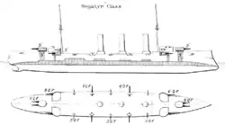 Разрабатывая требования к дальнему разведчику специалисты МТК стремились получить крейсер, более сильный и быстроходный, чем аналогичные крейсера японского и британского флотов[4]. В качестве наиболее серьёзного и вероятного противника рассматривались японские бронепалубные крейсера типа «Касаги». Проект этих крейсеров разрабатывался на основе крейсера «Такасаго», построенного для японского флота британской компанией «Армстронг». «Касаги» и его систершип «Читосэ» строились в США, имела нормальное водоизмещение 4760—4900 тонн (полное приближалось к 6000 тонн), скорость 22,5 узла и вооружались двумя 203-мм орудиями в оконечностях и десятью 120-мм орудиями в бортовых установках[5]. Данные корабли считались наиболее боеспособными бронепалубными крейсерами японского флота и русский проект должен был их превзойти.