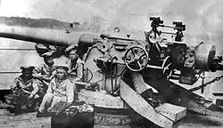 1914 год «Диана» встретила без артиллерии: крейсер предполагалось перестроить в учебно-артиллерийский корабль, вооружив новейшими 130-мм орудиями[30]. Начавшаяся война повлекла за собой спешное вооружение «Дианы» восемью 120-мм пушками, нашедшимися на складе. В октябре того же года крейсер вместо 120-мм пушек получил десять 152-мм орудий, снятых с учебного корабля «Император Александр II».
