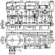 Котлы системы Бельвиля без экономайзеров, имевшие рабочее давление 17,2 атм, размещались в трёх котельных отделениях. Восемь котлов находились в носовом и кормовом отделениях, шесть — в среднем. Свежий пар в каждый из главных механизмов подавался через детандер, в котором давление понижалось с 17,2 атм в главном паропроводе до 12,9 атм на входе в паровую машину[21]. Общая площадь колосниковых решёток была 108 м², общая поверхность нагрева 3355 м²[23]. Каждая машина имела по три цилиндра, диаметром 800, 1273 и 1900 мм, рассчитанные на рабочее давление 12,9 атм (высокое), 5,5 атм (среднее) и 2,2 атм (низкое) соответственно[4][22]. Уголь загружался в ямы (12 нижних и 2 верхних), находившиеся в межбортовом пространстве у котельных отделений, а также в расположенные между броневой и батарейной палубами в районе машинных отделений восемь угольных ям для запасного топлива. В соответствии со спецификацией, угля должно было хватать на 4000 миль плавания 10-узловым ходом[22].