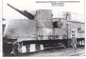 ![]() Бронепоезд «На Москву» в 1919 году. На фотографии он ещё не захвачен «красными», т.к. на обоих военных - погоны | |