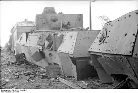 - В борту ближайшей бронеплощадки за открытой дверцей вертикальная амбразура 7,92-мм польского пулемёта Браунинг, также видно, что относительное положение паровоза и последних вагонов не строго по одной линии — то есть пути деформированы взрывами авиабомб, а возможно вагоны сошли с рельсов