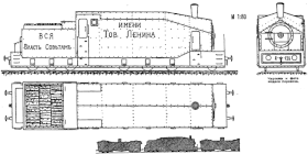 ![]() Чертёж бронепаровоза и схема состава бронепоезда «Путиловцы» имени тов. Ленина | |