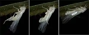 Вскоре после линьки насекомое выделяет через кишечник капли суспензии брохосом, которые либо подхватываются ногами и переносятся на кутикулу, либо (у нимф) размазываются по телу особыми движениями брюшка.[11] После высыхания суспензии, слой брохосом обрабатывается и выглаживается быстрыми движениями ног, снабженных рядами специализированных щетинок. Некоторые виды запасают сухие брохосомы на надкрыльях в виде белых плоских пятен секрета, которые ошибочно принимались за поля восковых желез.