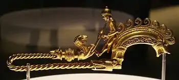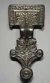 Т-образные фибулы | Т-образные фибулы появились, вероятно, в начале I тыс. н. э.[3], однако наиболее типичен этот тип фибул для варварских культур Раннего Средневековья. Большинство англосаксонских Т-образных фибул изготовлены из бронзы или меди, иногда с позолотой, и украшены орнаментом без дополнительных украшений в виде инкрустаций. |