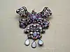 Брошь Севинье | Украшение эпохи барокко, представляет собой брошь в виде банта и одного или нескольких подвесков. Вероятно, первый вид броши, являющийся самостоятельным украшением и не выполняющим функцию застёжки. Брошь обязана своим появлением француженке мадам де Севинье, жившей в XVII веке[5]. В русских журналах первой половины XIX века брошью Севинье называлась крупная брошь овальной формы с тремя подвесками[6]. |